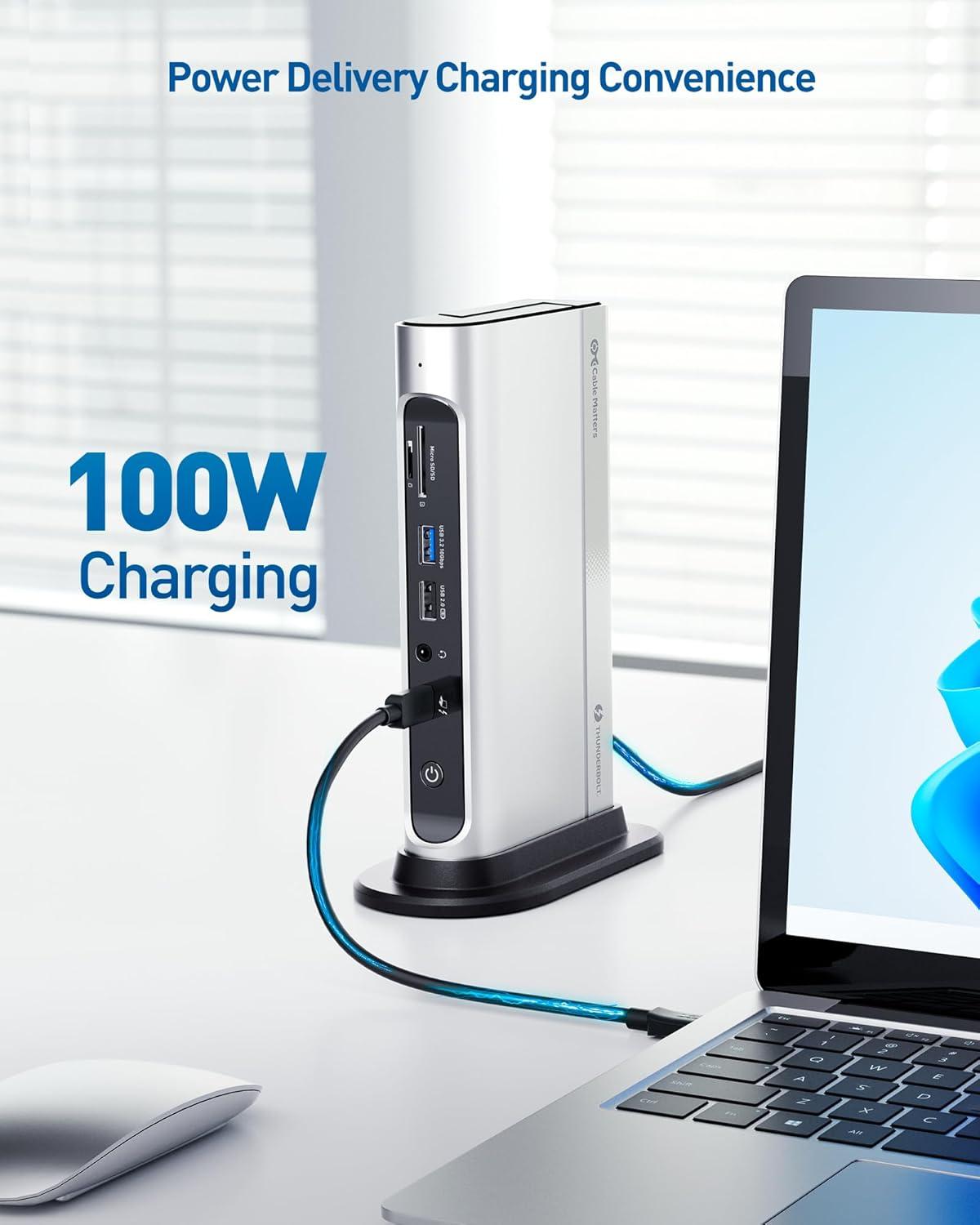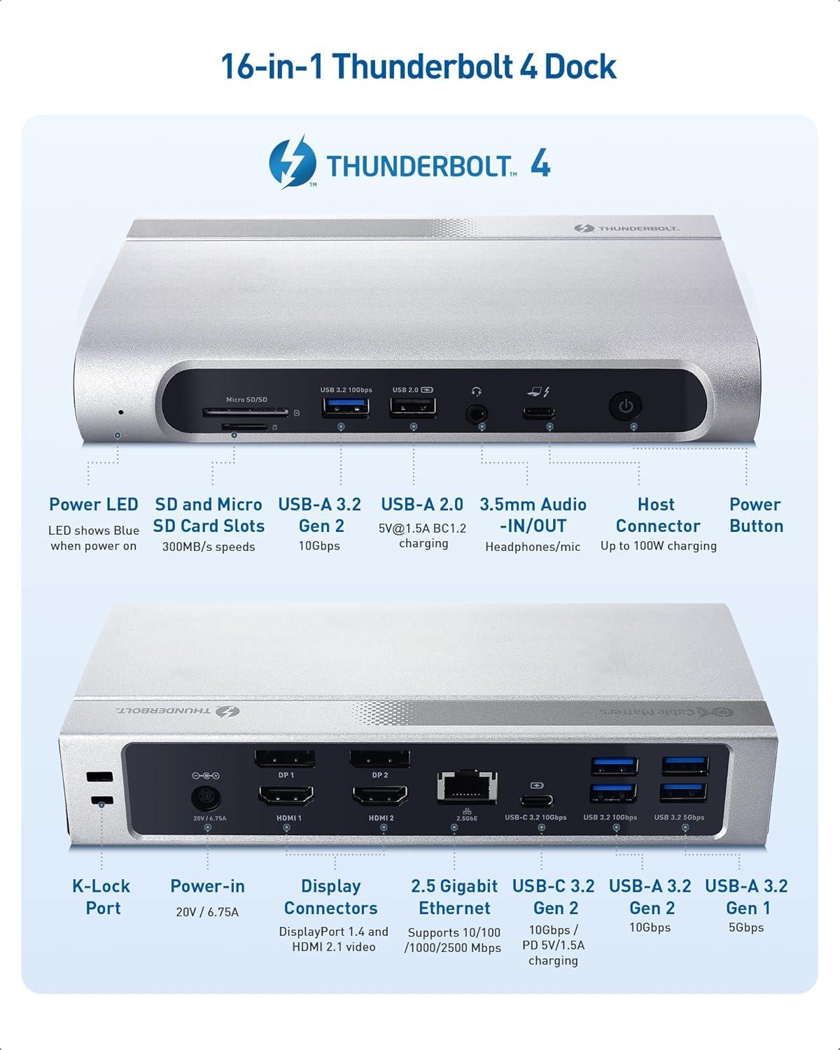 16-in-1 Thunderbolt 4 Dock: Unleash the power of Thunderbolt 4 with the ultimate Thunderbolt 4 docking station; This 16-in-1 Thunderbolt 4 dock with 100W charging does more than ever before with a single Thunderbolt 4 cable; Enjoy up to four 4K 60Hz displays on a Windows laptop or Dual 4K 60 Hz displays on a MacBook Pro with M2 / M3 Pro or M2 / M3 Max, 7x USB peripherals, 3.5mm audio, 2.5 Gigabit ethernet networking, and 100W PD charging with this Thunderbolt dock