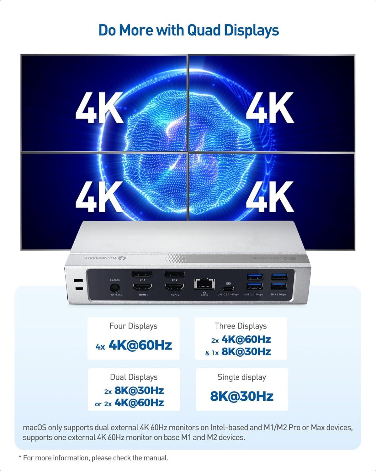 Quad 4K@60Hz Displays: Create the ultimate workspace with this quad-display capable docking station with 2x DisplayPort 1.4 and 2x 48Gbps HDMI 2.1 HDMI ports on a Windows laptop, 2x DisplayPort 1.4 or 2x 48Gbps HDMI 2.1 HDMI ports or 1 DisplayPort 1.4 + 1x HDMI 2.1 Port on a MacBook Pro with M2 / M3 Pro or M2 / M3 Max silicon. This Thunderbolt 4 dock supports a wide mixture of resolutions and refresh rates, from 1x 8K 60Hz display to quad 4K displays