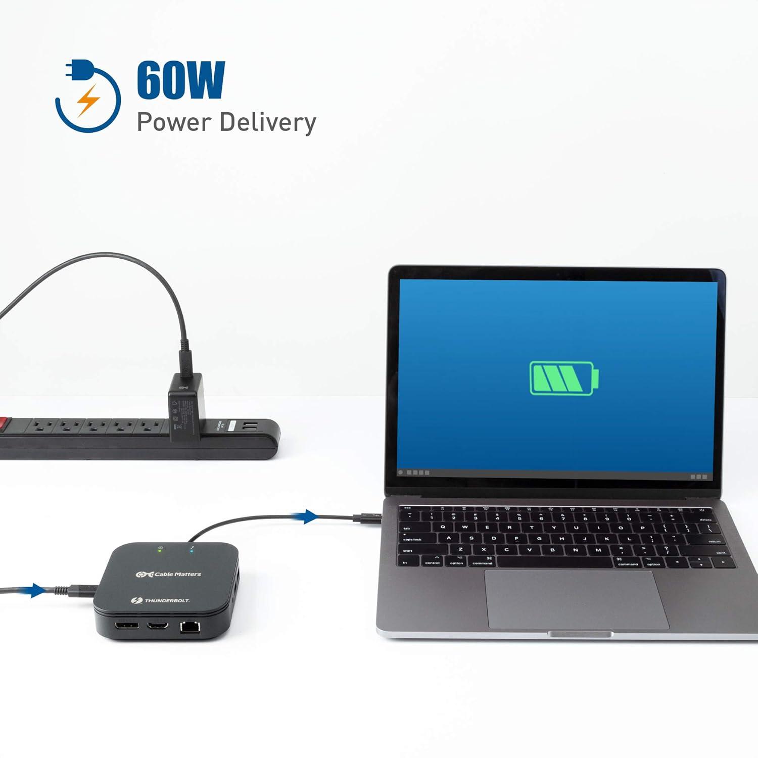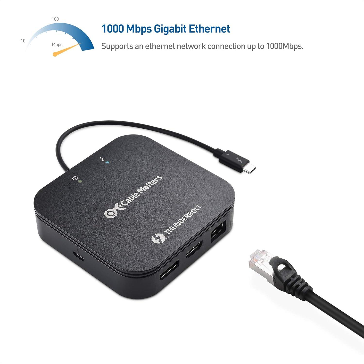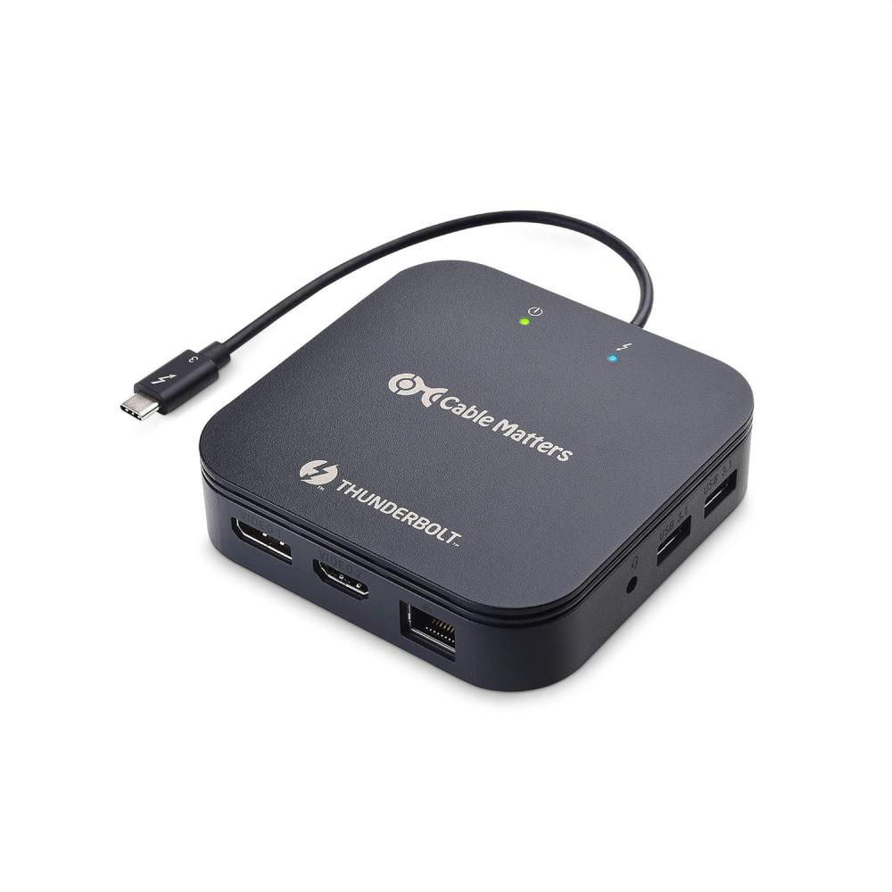Expand your connectivity with the Cable Matters Thunderbolt 3 docking station; Thunderbolt 3 hub turns a device’s Thunderbolt 3 port into a connectivity powerhouse with 2 video ports, 2 USB ports, a 3.5mm audio port, Gigabit Ethernet, and pass-through host charging